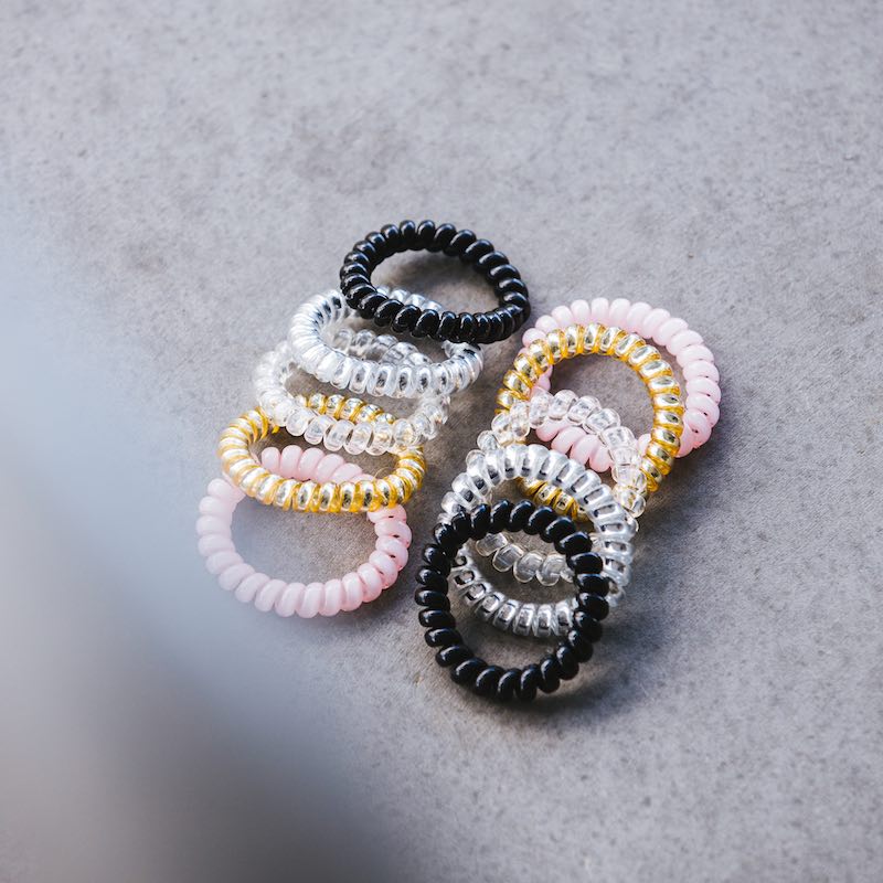 Dessa populära gummiband håller håruppsättningar och svansar på plats. Det elastiska materialet möjliggör även en sista snurr för det sista (hopplösa) varvet runt ditt hår. Hemligheten bakom är den smarta knorrformade designen (likt en telefonsladd) som automatiskt drar ihop sig och håller svansen på plats.